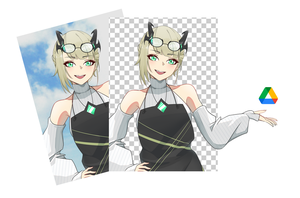 A Google Drive folder containing the finished artwork (.JPG) + character only artwork with transparent background (.PNG).